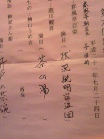 以前有線で聞いた時、細川家の若侍の、ムカつくくらいさわやかで、おまえ絶対早稲田の商学かなんかでラグビーやってる好青年だろう、みたいな声が印象的で、これを楽しみにしていたんだけど、さん喬さんも多少年をとったのか、あの音源ほどの声の張りがこの日はなかった。声の調子が悪かっただけかもしれないけど。残念。