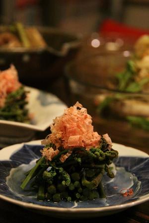 ワラビは出汁に浸して味をしみ込ませて、きれいに盛りつけてみたけど、本当は大量の鰹節と濃い口醤油と一緒にぐしゃぐしゃと混ぜ合わせておいたほうが美味しい。