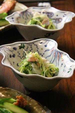 きゅうりを玉ねぎの酢の物には、焼いた鯛の身が入っている。