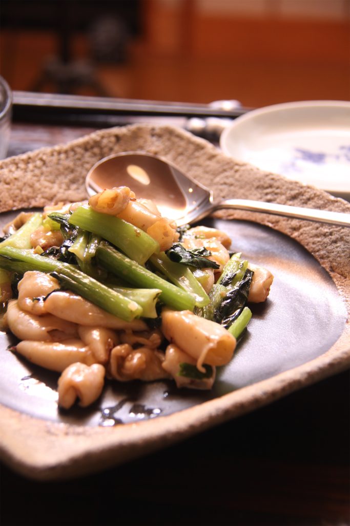ショートパスタみたいに見えるけど、これは、イカ子と小松菜の炒め物。