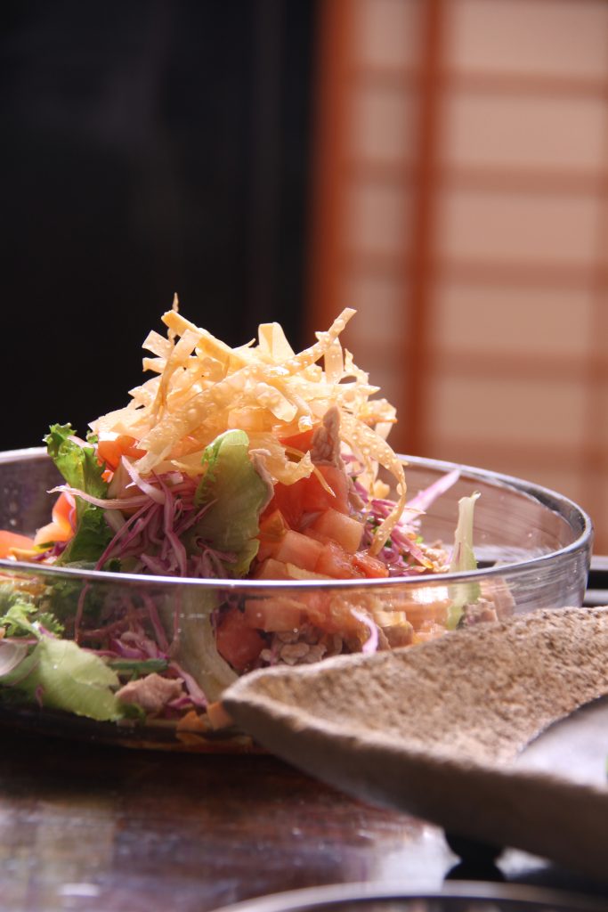 豚肉とかピーナツとか、焼売の皮の揚げたのとかが入った中華風サラダ。
