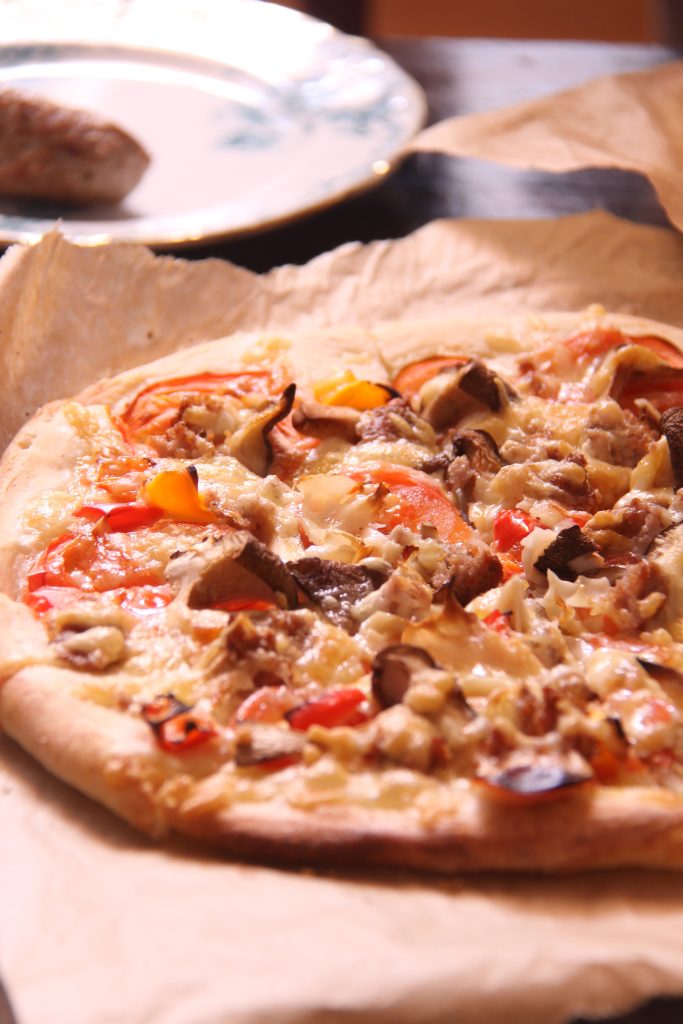 一枚はイワシ、もう一枚はシイタケと即席サルシッチャ。