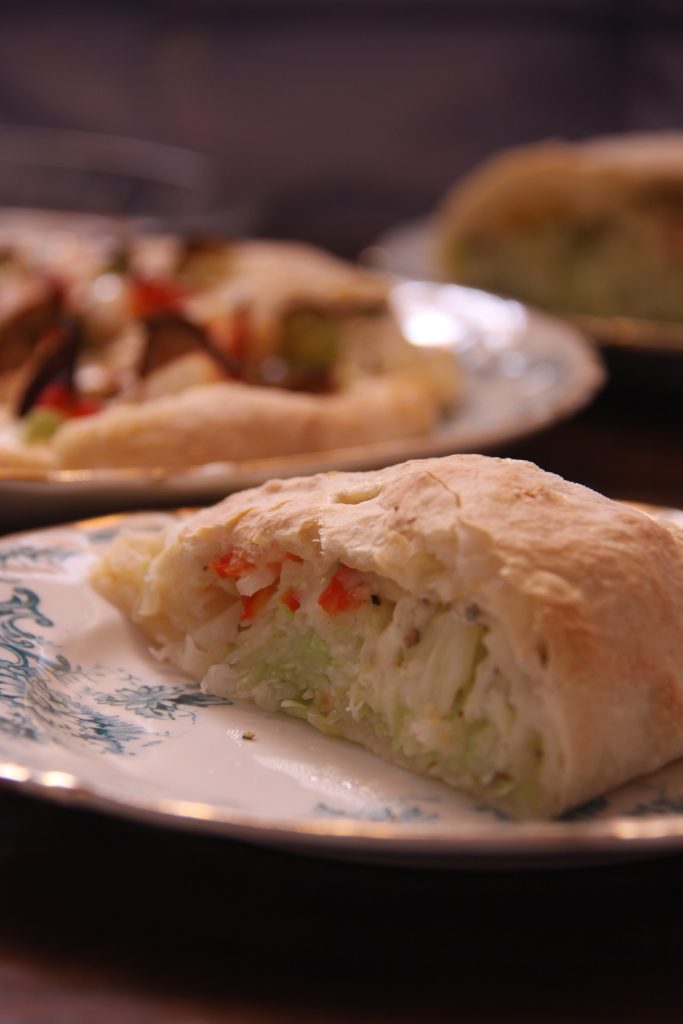 キャベツとチーズをピザ生地で包んで焼いとのとか、