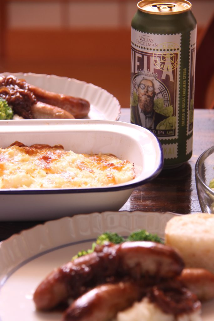 デパートの英国展で買って来たソーセージで、バンガーアンドマッシュ。