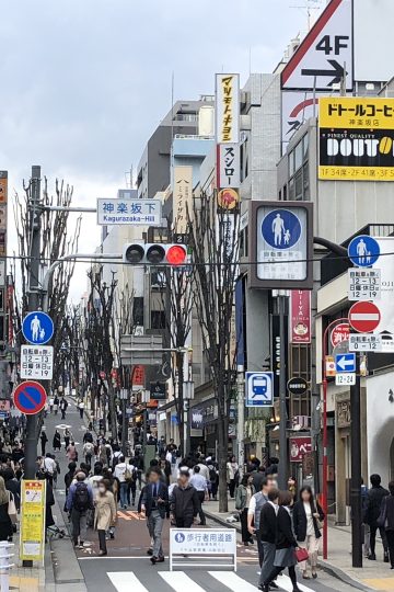 JR飯田橋東口を出て、神楽坂下交差点を渡ります。
